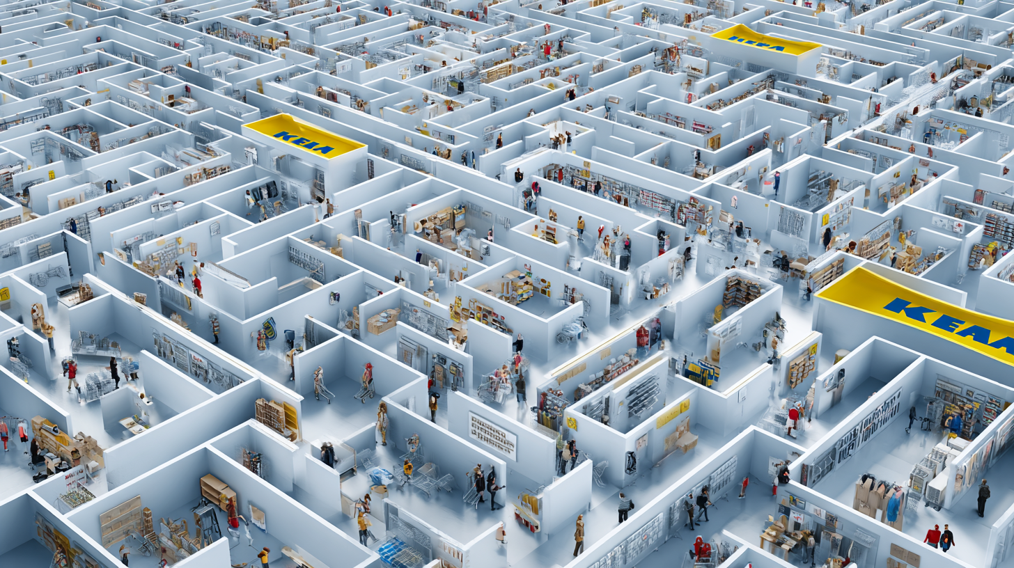 이케아 매장의 가장 큰 특징은, 소비자가 자유롭게 쇼핑할 수 없는 '단방향 미로(One-way Maze)' 동선입니다. 이는 소비자의 '체류 시간'을 극대화하고 '비계획 구매'를 유도하기 위한 정교한 설계입니다.