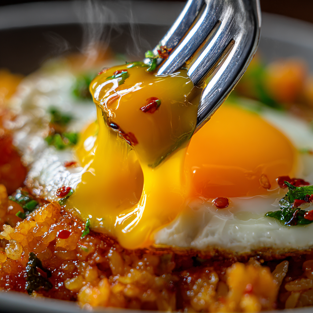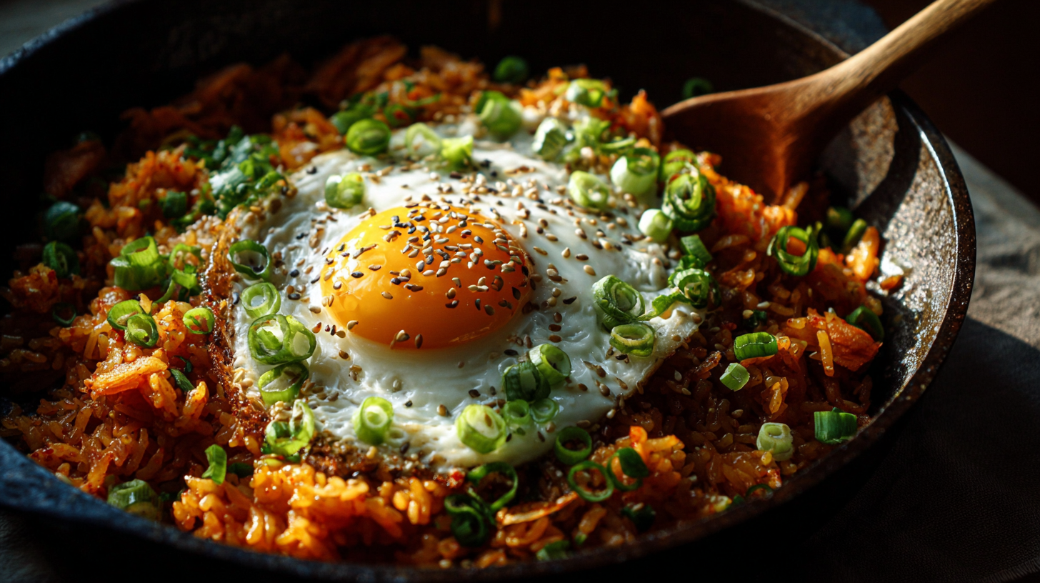 - 완성된 김치볶음밥을 그릇에 담고, 그 위에 계란후라이를 올린 뒤 통깨를 뿌려 완성합니다.